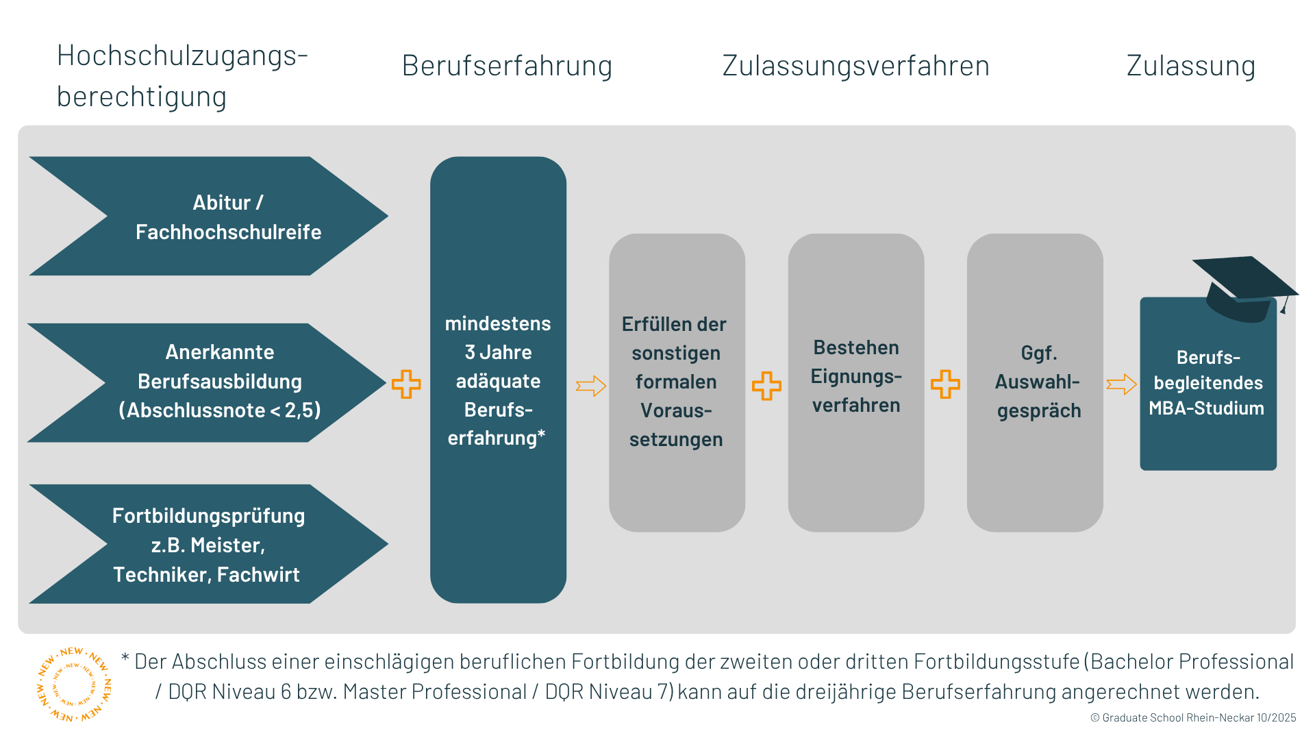 Die Zugangsmöglichkeiten sind im rheinland-pfälzischen Hochschulgesetz in § 35 Abs. 2 beschrieben. Wenn Sie eine mindestens dreijährige einschlägige Berufstätigkeit mit fachlichem Zusammenhang zum angestrebten Studium – nach Erlangung der schulischen oder beruflichen Hochschulzugangsberechtigung – vorweisen können, werden Sie zu einer Eignungsprüfung zugelassen, die die Gleichwertigkeit Ihrer beruflichen Qualifikation mit einem abgeschlossenen grundständigen Erststudium feststellen soll. Wenn Sie diese erfolgreich bestehen, können Sie bei uns zu allen Weiterbildungsmastern mit dem Abschluss Master of Business Administration (MBA) zugelassen werden, die wir für die Hochschule für Wirtschaft und Gesellschaft Ludwigshafen anbieten.